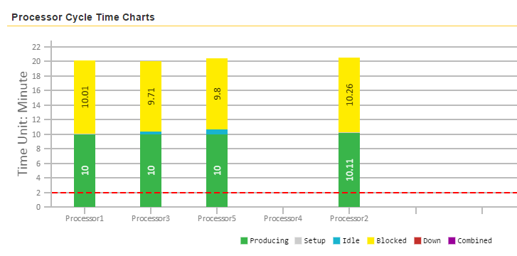 加工周期時間表可以直觀地看到模型的仿真數(shù)據(jù)。紅色虛線是模擬中報告的節(jié)拍時間。