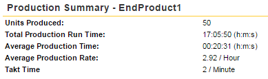 生產(chǎn)摘要報告顯示模型的生產(chǎn)單位,總生產(chǎn)運行時間,平均生產(chǎn)時間,平均生產(chǎn)率和生產(chǎn)節(jié)拍時間。
